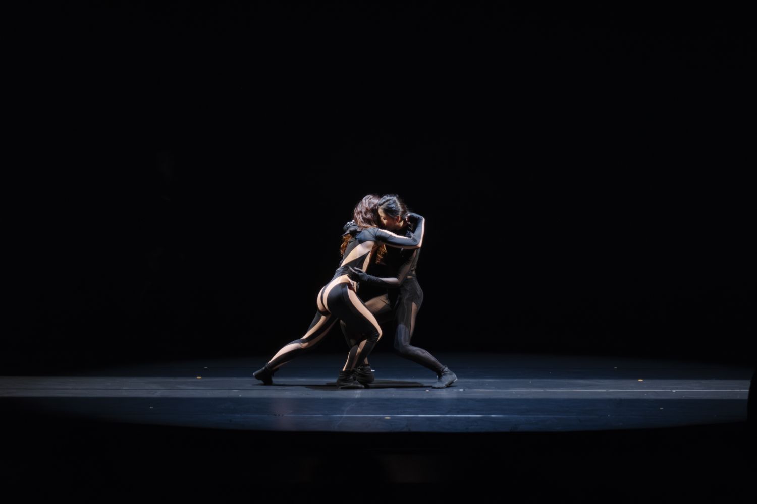 La pièce immersive ThREE embrasse le public avec un paysage sonore octophonique et des visuels holographiques. Grâce à la technologie de capture de mouvements, les gestes des danseuses se déploient dans tout le théâtre.