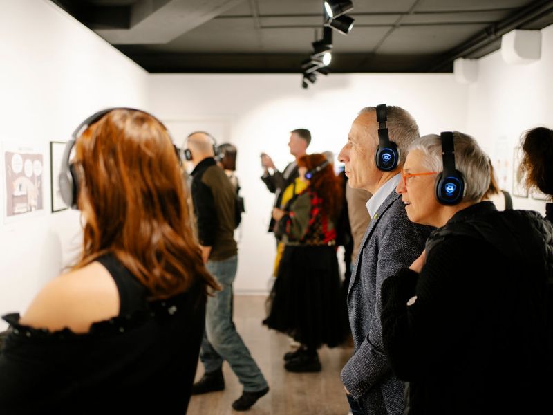 Lors de la visite de l’exposition, le public est muni de casques audios. Commence dès lors une déambulation musicale créée par les participant·e·s à ce projet de médiation culturelle conduit par Andrée Oriet en collaboration avec Jura désistance et soutenu par le fOrum Culture. La réalisation de la bande son est effectuée par Alain Tissot.